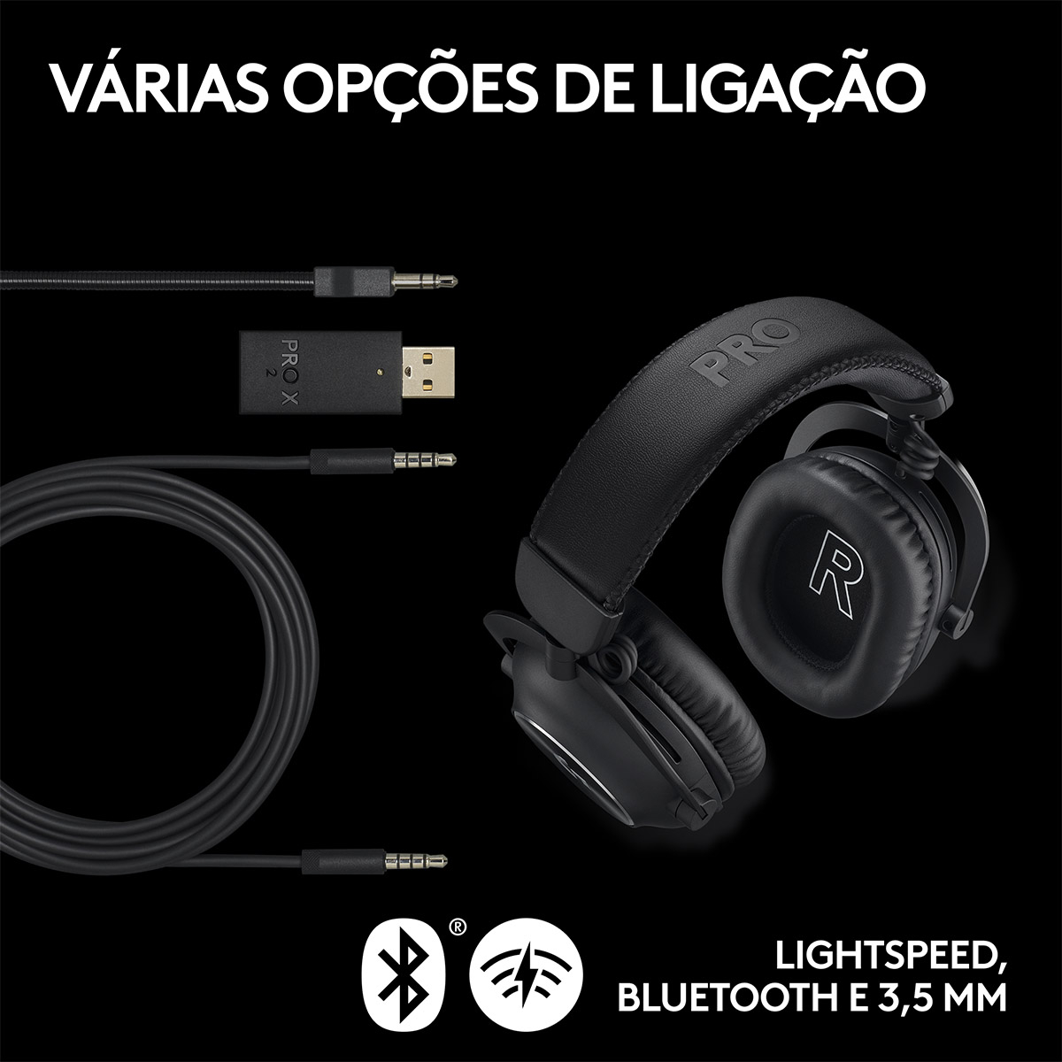 Conectividade: Ligação sem fios LIGHTSPEED, Bluetooth, USB e cabo auxiliar de 3,5 mm para opções de conectividade; cabo USB-A para USB-C, dongle USB-A com porta de 3,5 mm, cabo de áudio de 3,5 mm incluído