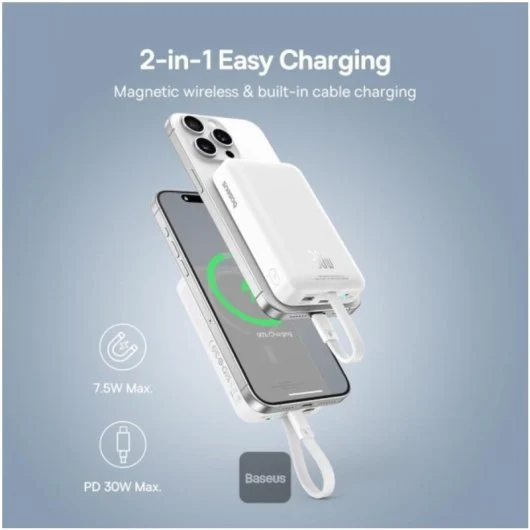 - Power Bank 2 em 1: Para além do carregamento magnético, o carregador de telemóvel portátil Baseus oferece carregamento por cabo USB-C, proporcionando versatilidade para diferentes necessidades de carregamento.